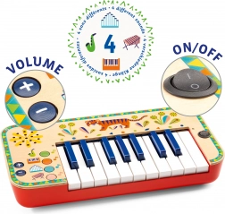 Acest sintetizator pentru copii, de calitate, în execuție din lemn, îi va încânta atât pe micii muzicieni, cât și pe părinți. Datorită designului vesel, pictat manual, și finisajului plăcut, este un prim pas excelent în lumea muzicii. Cântatul la instrument susține percepția auditivă, coordonarea mână-ochi și creativitatea.