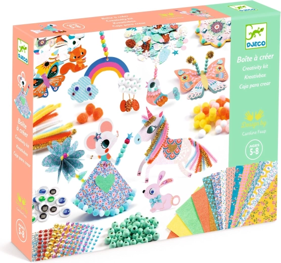Cutia creativă Lumea Curcubeului de la DJECO este un set cadou ideal pentru micii creatori. Datorită conținutului bogat într-o cutie practică pe două niveluri, copiii pot realiza cu ușurință propriile decorațiuni, mici ornamente și figurine vesele. Setul este conceput pentru a distra și, în același timp, a dezvolta abilități importante.