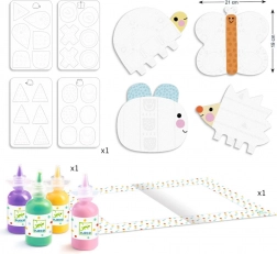 Sunt incluse planșe rezistente cu animăluțe simpatice și vopsele ușor de spălat. Copiii pot aplica vopseaua, o pot lăsa să se usuce puțin și pot completa imaginea prin lipirea sau aplicarea pieselor conform instrucțiunilor. O activitate excelentă pentru dezvoltarea motricității fine, percepției senzoriale și creativității.