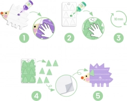 Ghidul ilustrat îi conduce pe copii spre rezultat: aplică vopseaua, lasă să se usuce, desprinde piesele și completează animăluțul.