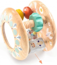 Baby Tutti este o jucărie din lemn concepută cu grijă, ușor de apucat, care zornăie plăcut și se rostogolește după ce este pusă jos. Îi captivează pe cei mici prin curgerea colorată a mărgelelor în tubul transparent, o mică oglindă pentru primele descoperiri și inele glisante pe tije. Jucăria susține coordonarea mână–ochi și motivează la târât și întoarcere.