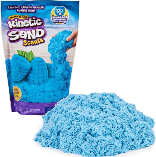 Nisipul Kinetic Sand albastru cu aromă de afine combină modelabilitatea cu un parfum plăcut pentru și mai multă plăcere a jocului și relaxare.