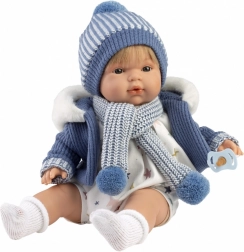 Prelucrarea și materialele de înaltă calitate sunt tipice pentru brandul LLORENS: corp textil moale din bumbac pentru îmbrățișări plăcute, mâini, picioare și cap din vinil rezistent pentru îmbrăcare ușoară. Hăinuțele sunt cusute din bumbac organic, lână și materiale reciclate. Setul include îmbrăcăminte de iarnă în cinci piese, suzetă și tot ce este necesar pentru joacă imediată.