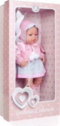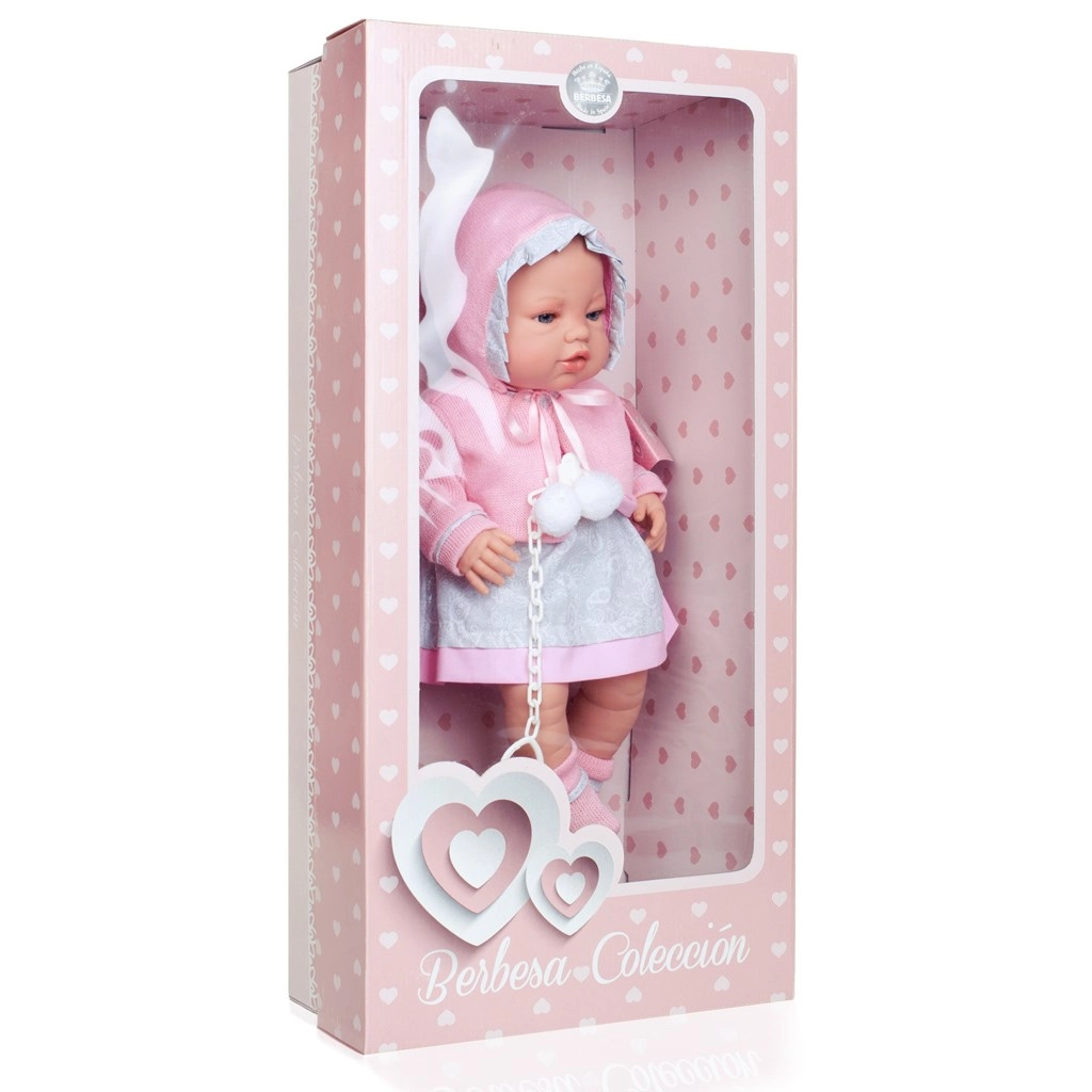 Adorabila păpușă bebeluș Berbesa Amanda 43 cm, cu detalii realiste și o aromă fină de vanilie, va încânta orice copil. Are un corp din vinil cu membre mobile, un chip drăgălaș și ochi albaștri superbi. Setul include cardigan tricotat, căciuliță cu volănaș, rochiță, chiloței și șosete, precum și un suzi la lanț. Potrivită pentru copii de la 3 ani.