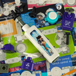 - cutie cu capac, stație de alimentare cu baterii, modul întrerupător, cheie luminoasă a circuitului, modul cu regulator rotativ, modul radar, modul luminos, modul muzical, modul ventilator, modul ghid de lumină, 12 carduri de sarcini, șurubelniță electrică, 12 module cu patru căi, 12 șuruburi, 10 module de circuit, instrucțiuni