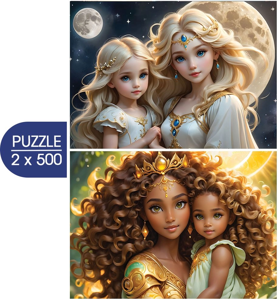 Bucură-te de relaxare cu un set elegant de două puzzle-uri a câte 500 de piese, cu motivul mamă și fiică inspirat de simbolurile lunii și soarelui. Ideal pentru iubitorii de ilustrații artistice, execuție de calitate și momente plăcute acasă.
