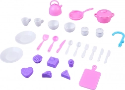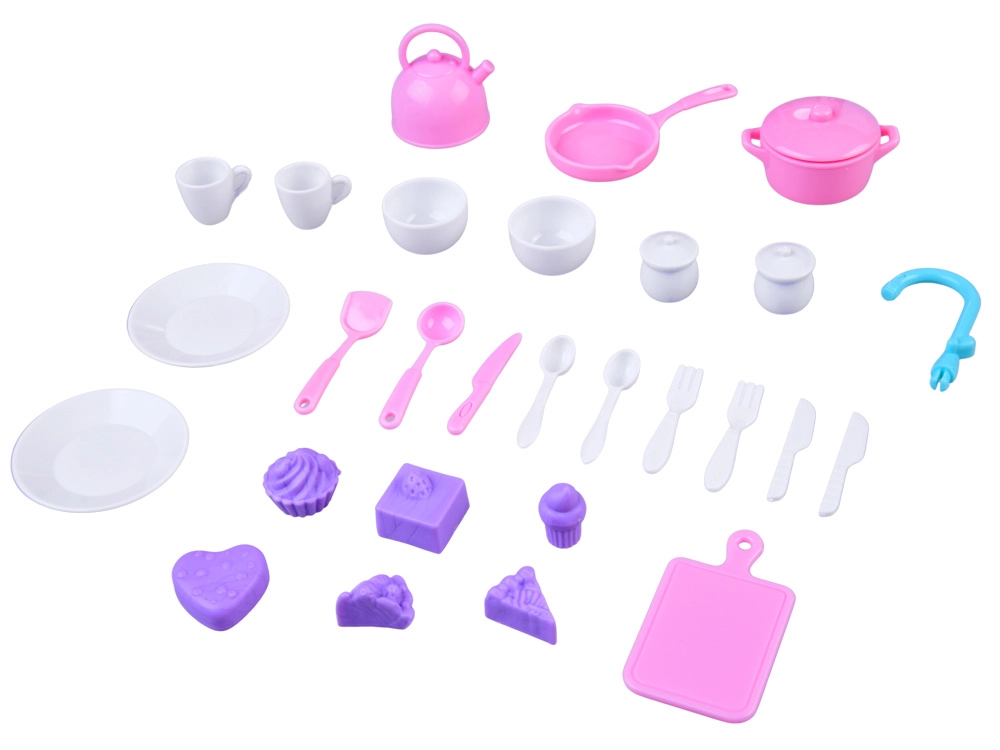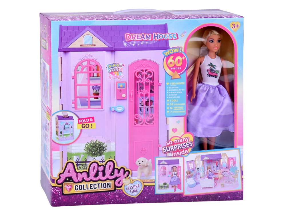 - Căsuță‑valiză pliabilă, păpușă ANLILY, cadă, WC, pat cu lenjerie, comodă cu sertare, cuier pentru haine, măsuță de toaletă și taburet, colț de bucătărie cu chiuvetă și plită, masă rotundă, 2 scaune, candelabru, figurină cățeluș, podea (poster gros), 3 rochii, 2 perechi de pantofi cu toc, 2 umerașe, oglindă de mână, pieptene, uscător de păr, 2 flacoane de parfum, balsam, tub de cremă, 2 tuburi de pastă de dinți, 2 periuțe, săpun cu săpunieră, 2 pahare, laptop, oală cu capac, tigaie, ceainic, 2 farfurii, 2 boluri, 2 căni, 2 pahare, tocător, 2 seturi de tacâmuri, polonic, spatulă, cuțit, prăjituri