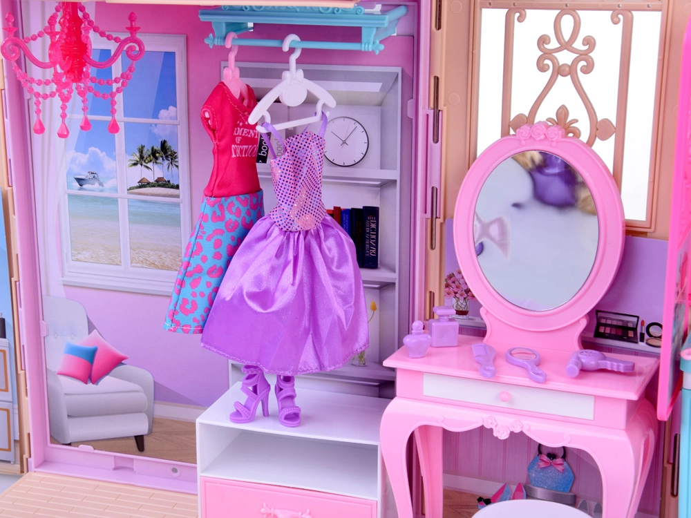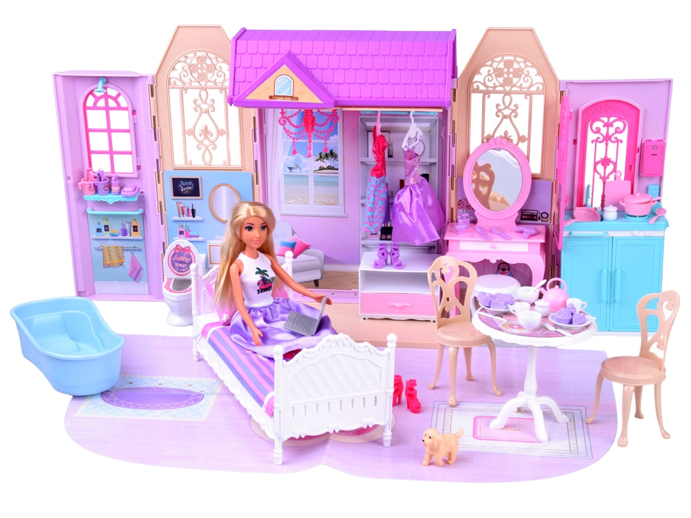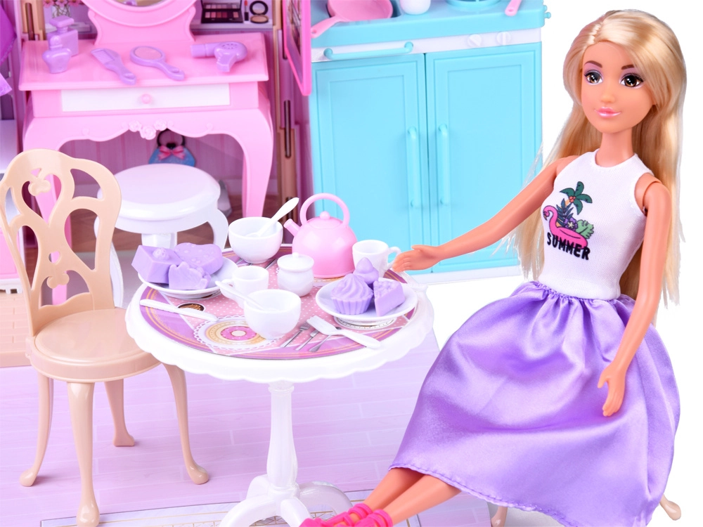 Baia, dormitorul cu măsuță de toaletă și bucătăria formează un cămin complet pentru păpușă. Ușile și ferestrele care se deschid, precum și decorațiunile detaliate, stimulează imaginația și jocul realist.
