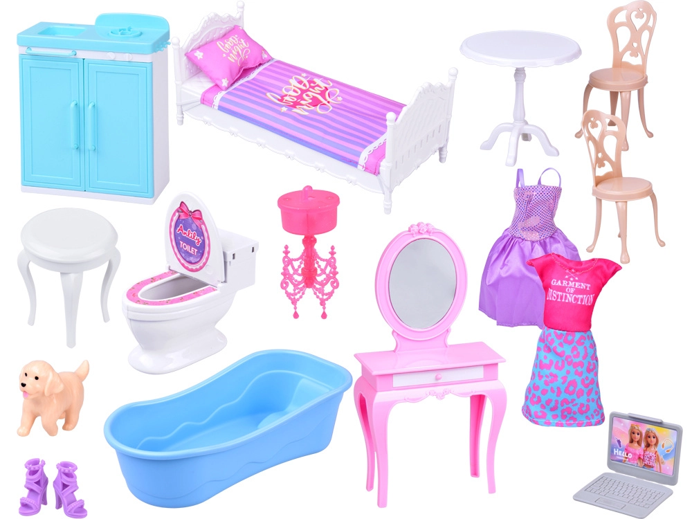 - Set mare de accesorii – hăinuțe, pantofi, veselă, accesorii cosmetice și pentru păr, laptop și figurina cățeluș.