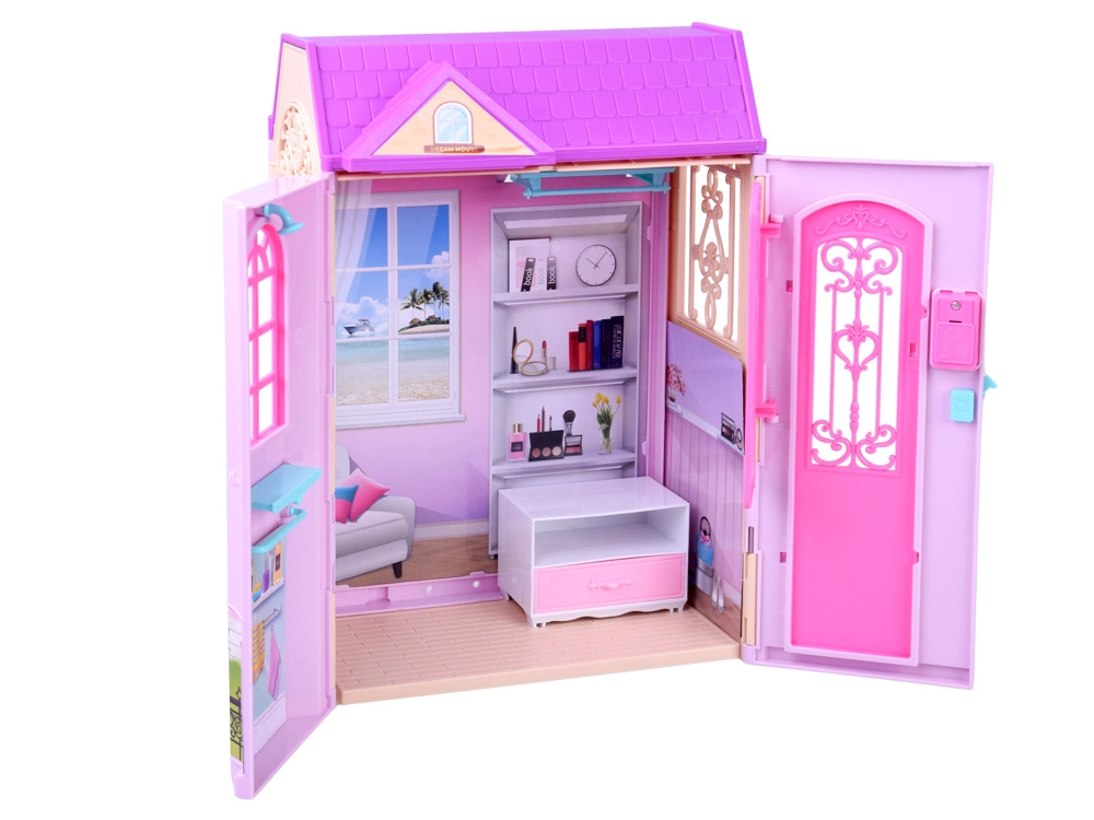 Căsuța pliabilă portabilă pentru păpuși, cu accesorii bogate și păpușa ANLILY 30 cm, transformă orice moment într-un joc de imaginație. După deschidere, căsuța devine trei încăperi – baie, dormitor cu măsuță de toaletă și bucătărie. Datorită formei de valiză cu mâner se transportă ușor, iar totul poate fi depozitat în interior după joacă. Nu lipsesc mobilierul, hăinuțele, bucătăria, baia și nici animăluțul drăgălaș. Soneria de la ușă are efect sonor pe baterii.