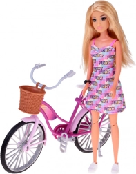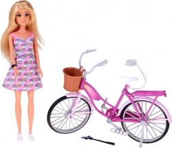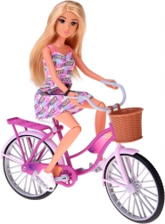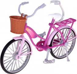 Bicicleta roz‑mov, cu coș frontal, portbagaj posterior, pedale și roți spițate, se rostogolește liber și se manevrează ușor. Șaua cu suport menține păpușa stabilă în timpul „mersului”.