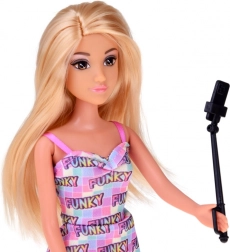 Păpușa are genunchi și coate articulate, astfel încât pozează ușor la mers, fotografiere și în alte scenete. Rochia modernă FUNKY și adidașii albi sunt completate de un accesoriu stilat – ceas inteligent.