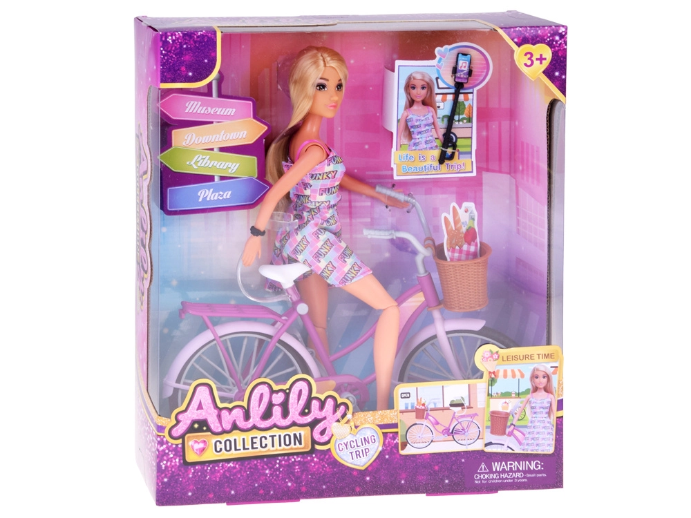 Descoperă o lume a imaginației cu păpușa ANLILY, care adoră plimbările prin parcuri și pe străduțe urbane. Datorită membre-lor articulate adoptă cu ușurință poziții de mers și selfie, iar rochia ei colorată cu inscripția FUNKY subliniază stilul modern. Pachetul include o bicicletă detaliată în culori pastel pentru o deplasare lină și o poziție stabilă a păpușii.