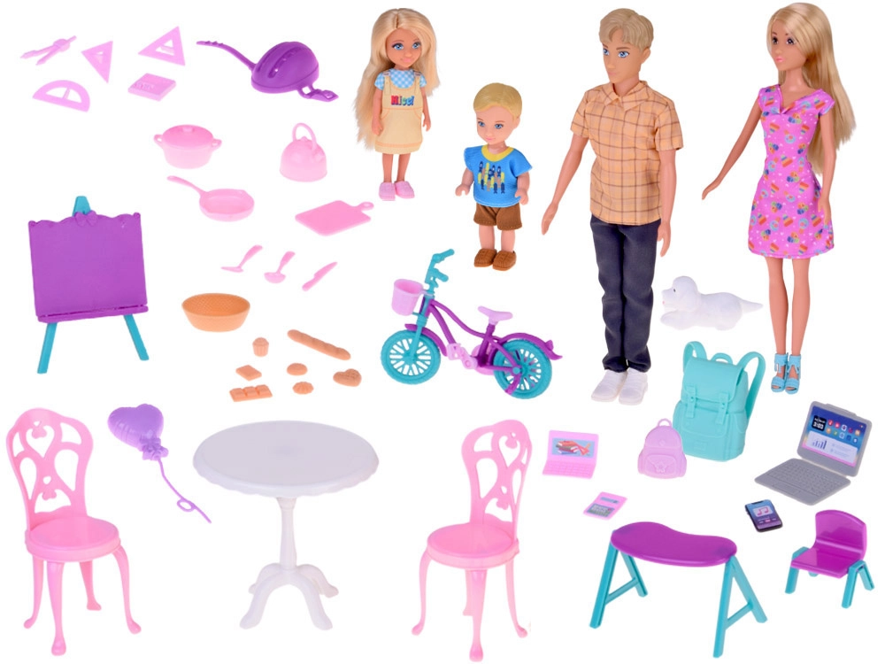 Descoperiți setul versatil ANLILY, care sprijină creativitatea, empatia și abilitățile sociale prin joc realist de-a familia. Două păpuși adulte, două păpuși copii și un cățeluș drăgălaș, completate de mobilier, rechizite școlare și echipamente de lucru, creează mediul ideal pentru role‑play din viața de zi cu zi.