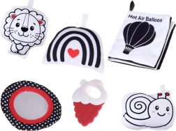 Figurine moi, cărticică cu contrast, zornăitoare, oglindă și jucărie de dentiție încurajează prinderea, coordonarea mână‑ochi și percepția senzorială.