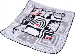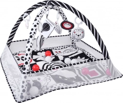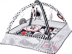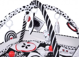 Modelele contrastante (negru, alb, roșu) ajută bebelușul să focalizeze mai bine și stimulează dezvoltarea vizuală. Suprafața moale susține timpul petrecut pe burtică, ridicarea căpușorului și întărirea mușchilor gâtului și spatelui – pași esențiali către rostogolire, târâre și mers.