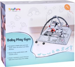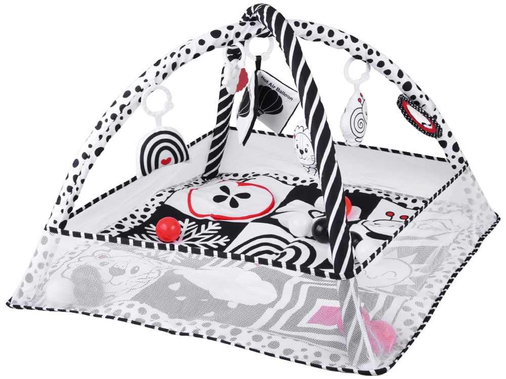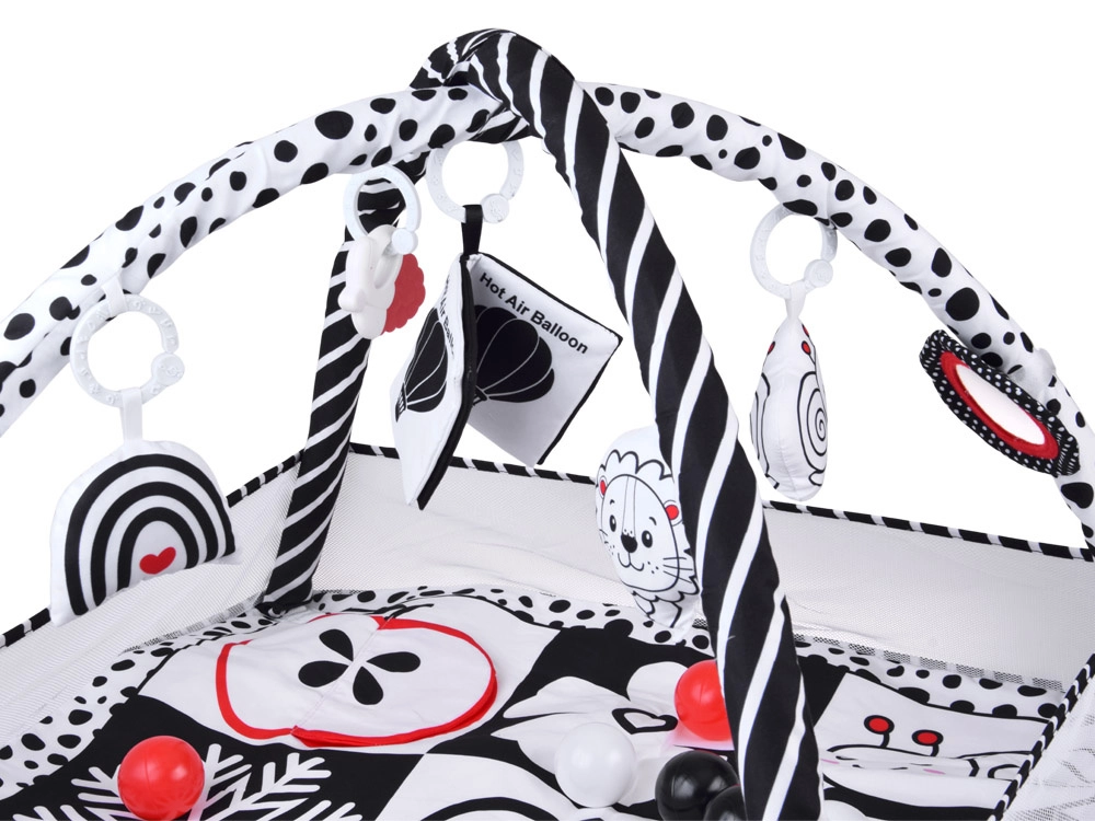 Două arcuri moale capitonate cu diverse jucării suspendate motivează întinderea, prinderea și mișcarea. Lateralele din plasă transformă rapid covorașul într-un țarc primitor cu mingi, pentru joacă în siguranță sub supravegherea adulților.