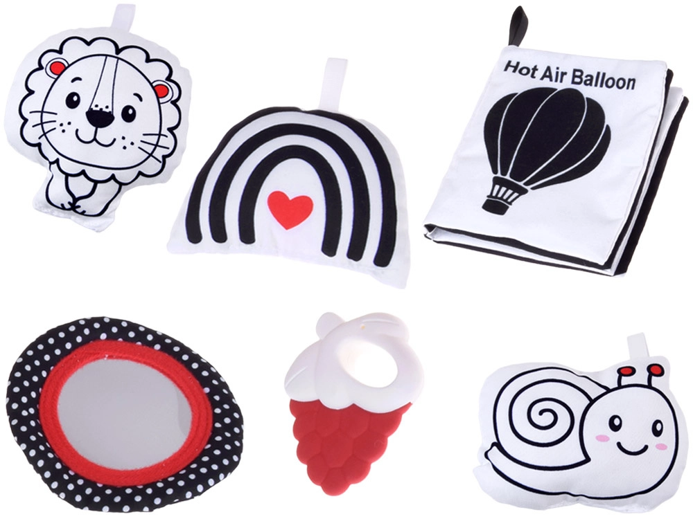 Modelele alb‑negru cu accente roșii susțin focalizarea, urmărirea mișcării și atenția naturală a nou‑născuților încă din primele zile.