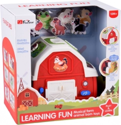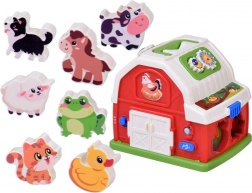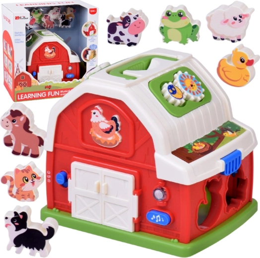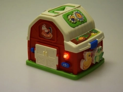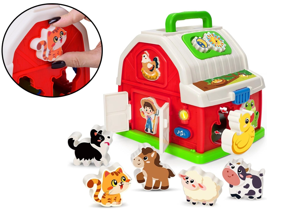 Butonul cu notă muzicală pornește melodii vesele, un comutator special aprinde luminița, iar la apăsarea pe animăluțe se aud sunete realiste de fermă.