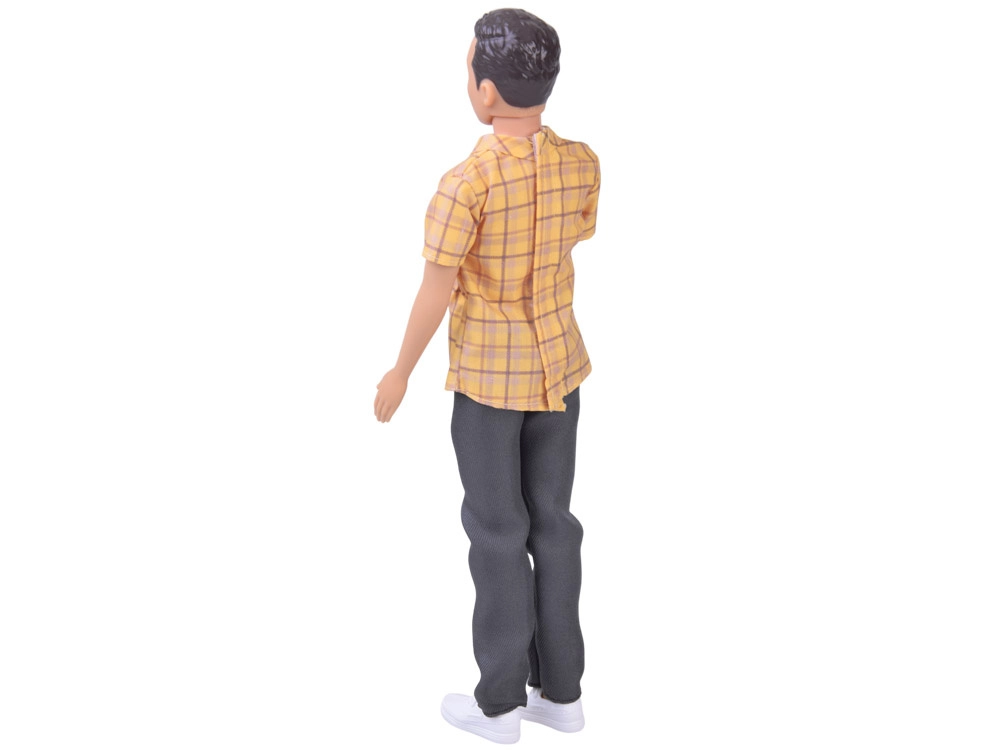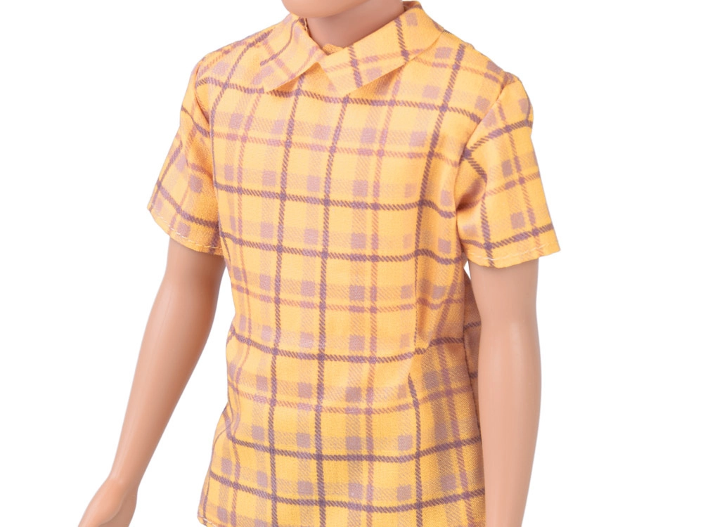 Ținuta îmbină stilul lejer și culorile accent: cămașă galbenă în carouri, pantaloni închiși la culoare și teniși albi formează un set universal pentru diverse situații de joc. Membrele articulate permit posturi naturale și scene dinamice, susținând dezvoltarea imaginației și a motricității fine.