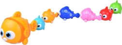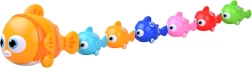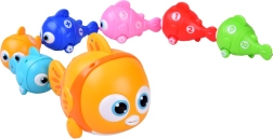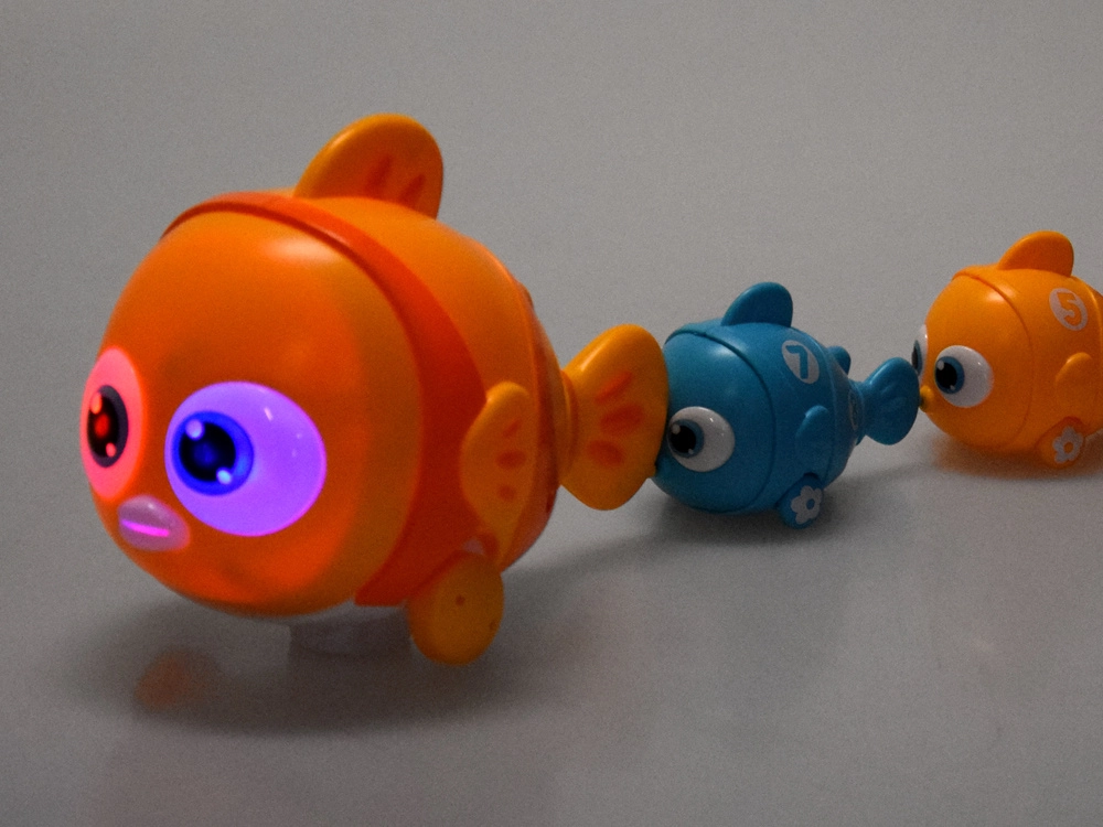 Familia interactivă de pești transformă fiecare zi într-o aventură creativă. Peștele mare cu baterii se deplasează înainte, luminează cu ochii și cântă, în timp ce peștișorii mai mici se prind datorită magneților de coadă sau gură și formează un trenuleț acvatic colorat. Fiecare peștișor mic are numere tipărite, astfel încât copiii pot exersa numărarea și secvențele simple.