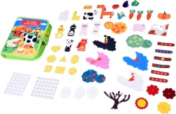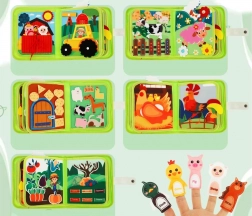 Copiii descoperă animalele domestice, culorile, formele și culturile. Mutând piesele, creează propriile scenete și își dezvoltă vocabularul și imaginația.