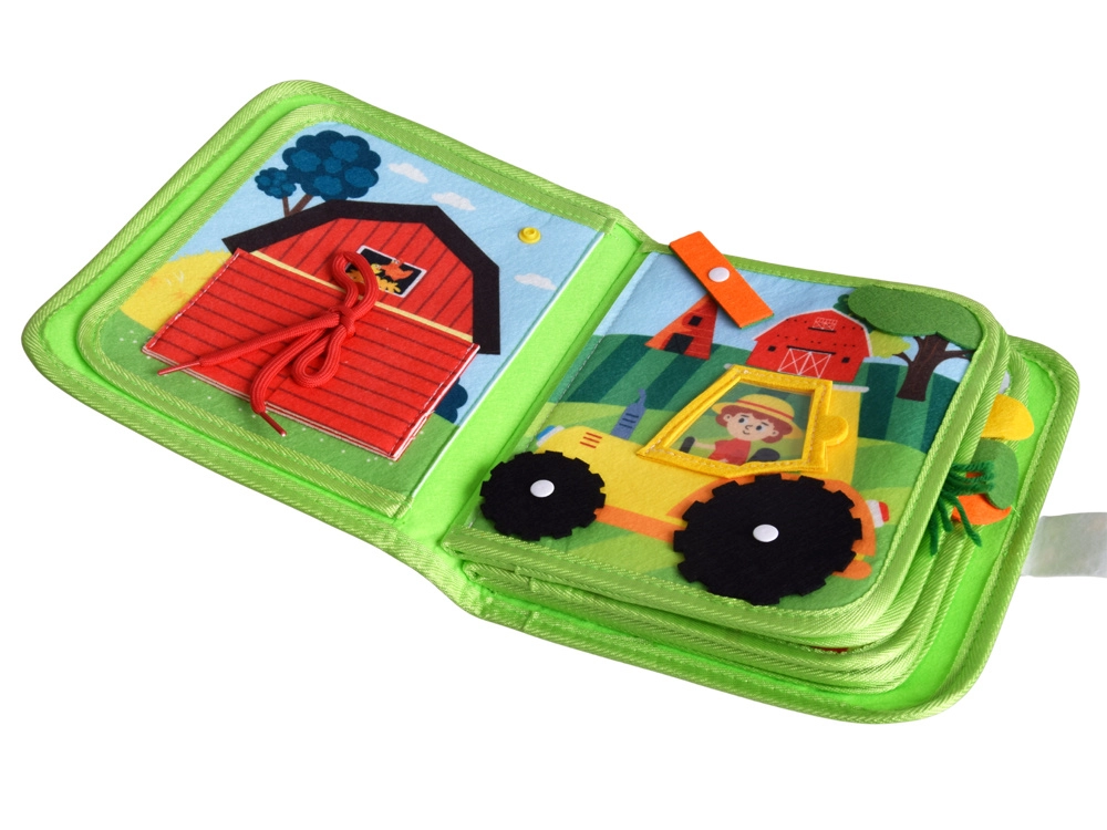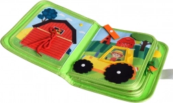 Această cărticică senzorială din material textil, cu tematică de fermă, oferă copiilor ore întregi de joacă creativă. Pe fiecare pagină îi așteaptă animăluțe, legume, tractor și hambar, care pot fi mutate și combinate datorită ariciului. Copiii pot ridica ferestruici, roti roțile tractorului sau lega șiretul și pot descoperi ce se ascunde la fermă.