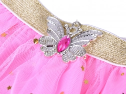Tiul ușor cu steluțe și lună, talie elastică aurie și ornament cu fluture în față. Se unduiește frumos la dans și joacă.