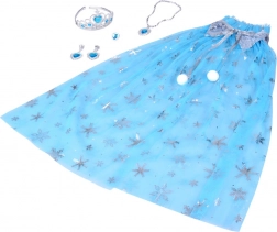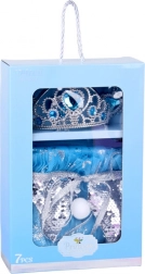 Setul include o colecție completă de bijuterii: coroană din plastic cu „pietre prețioase” albastre, colier cu pandantiv în formă de picătură, inel statement și cercei clip-on cu pietre în formă de inimă. Toate sunt ușoare, confortabile și potrivite pentru jocurile de costum ale copiilor.