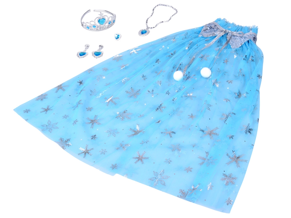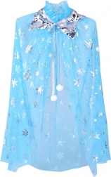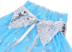 Pelerină elegantă din tul ușor, translucid, decorată cu fulgi de zăpadă argintii și guler cu paiete. Prindere cu pompoane albe moi la gât pentru purtare confortabilă și sigură. Tonurile reci de albastru, cu sclipiri argintii, creează un aspect de iarnă fermecător, îndrăgit de copii.