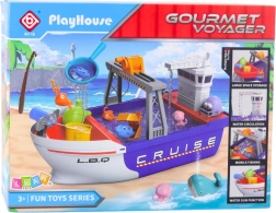 Această barcă mare și stabilă pentru baie sau camera de joacă aduce o experiență de joacă acvatică cu adevărat realistă. Circuitul de apă închis cu pompă electrică economisește apă și permite turnarea continuă în pahare și „spălarea vaselor”. Copiii își pot asuma rolul de mici pescari datorită macaralei mobile, prinderii peștilor cu undița și manevrării accesoriilor.