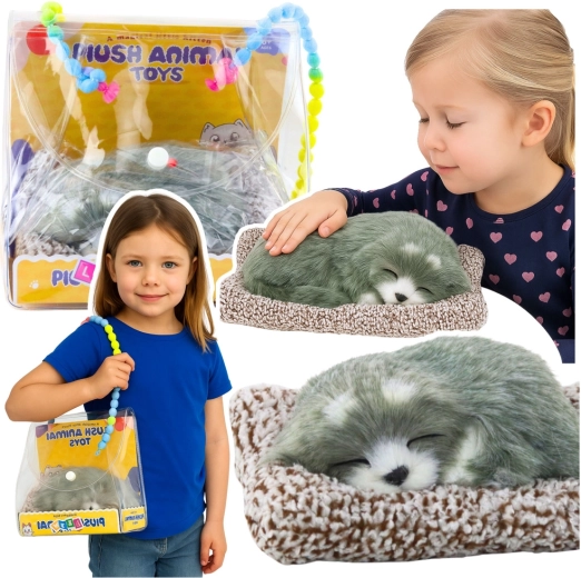 Detaliile fidele și blănița catifelată îl fac să pară un cățel adormit adevărat – ideal ca decorațiune și companion de alint.
