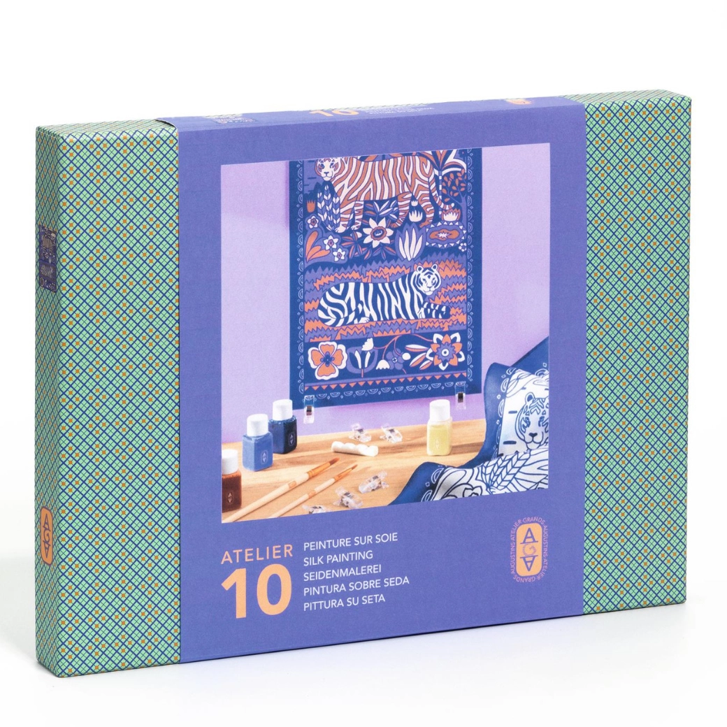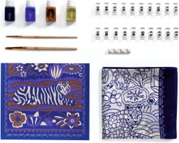 Descoperă farmecul delicat al picturii pe mătase cu setul creativ DJECO. Creează-ți un eșarfă originală cu motiv preimprimat de tigru și flori – ideală pentru începători și avansați. Setul include vopsele pentru textile, pensule, cleme și cadru pentru întindere ușoară. Activitatea este simplă, relaxantă, iar rezultatul este un accesoriu din mătase strălucitor sau o decorațiune de design pentru interior.