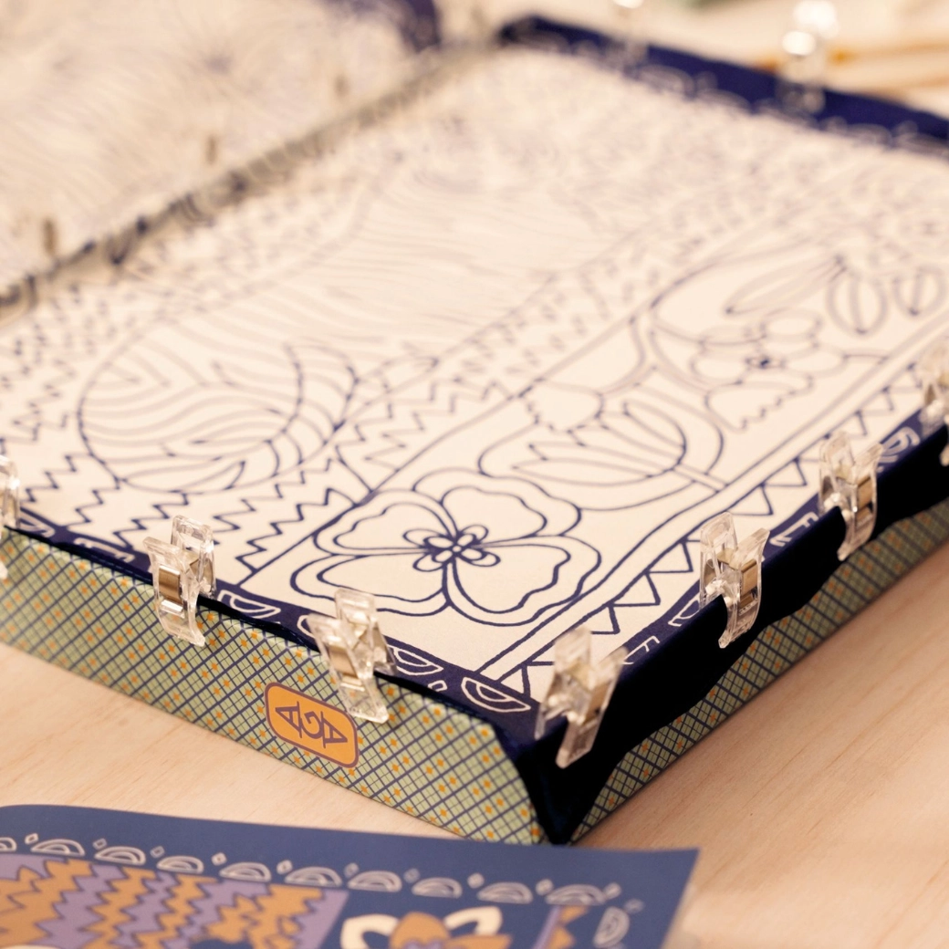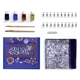 În cutie găsești eșarfa din mătase cu motiv, set de vopsele pentru textile, pensule, cleme și organizatoare practice. Doar desfaci și începi să creezi.
