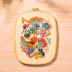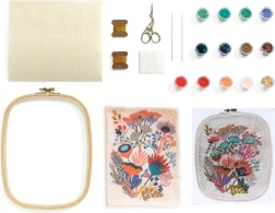 Set complet cu ramă de lemn, material textil imprimat, ațe, ace și mărgele. Deschide cutia și poți începe.
