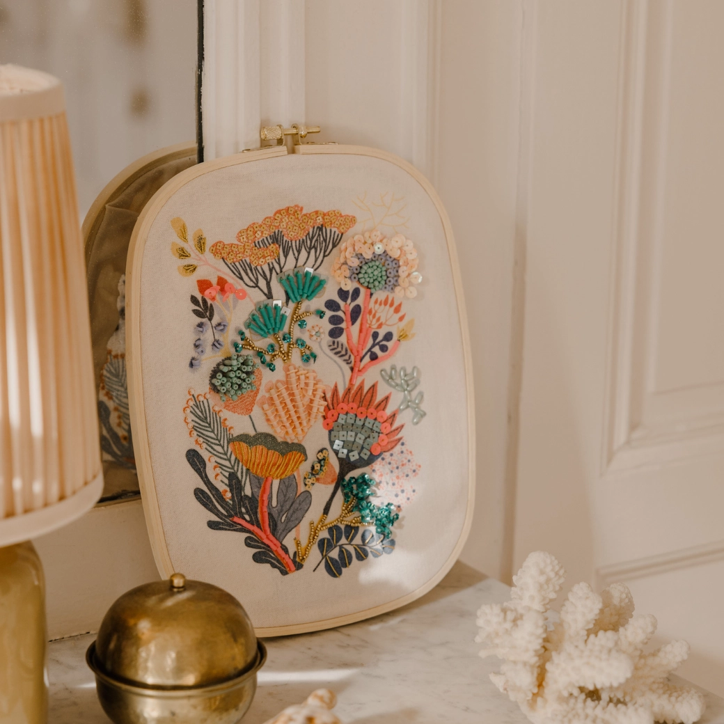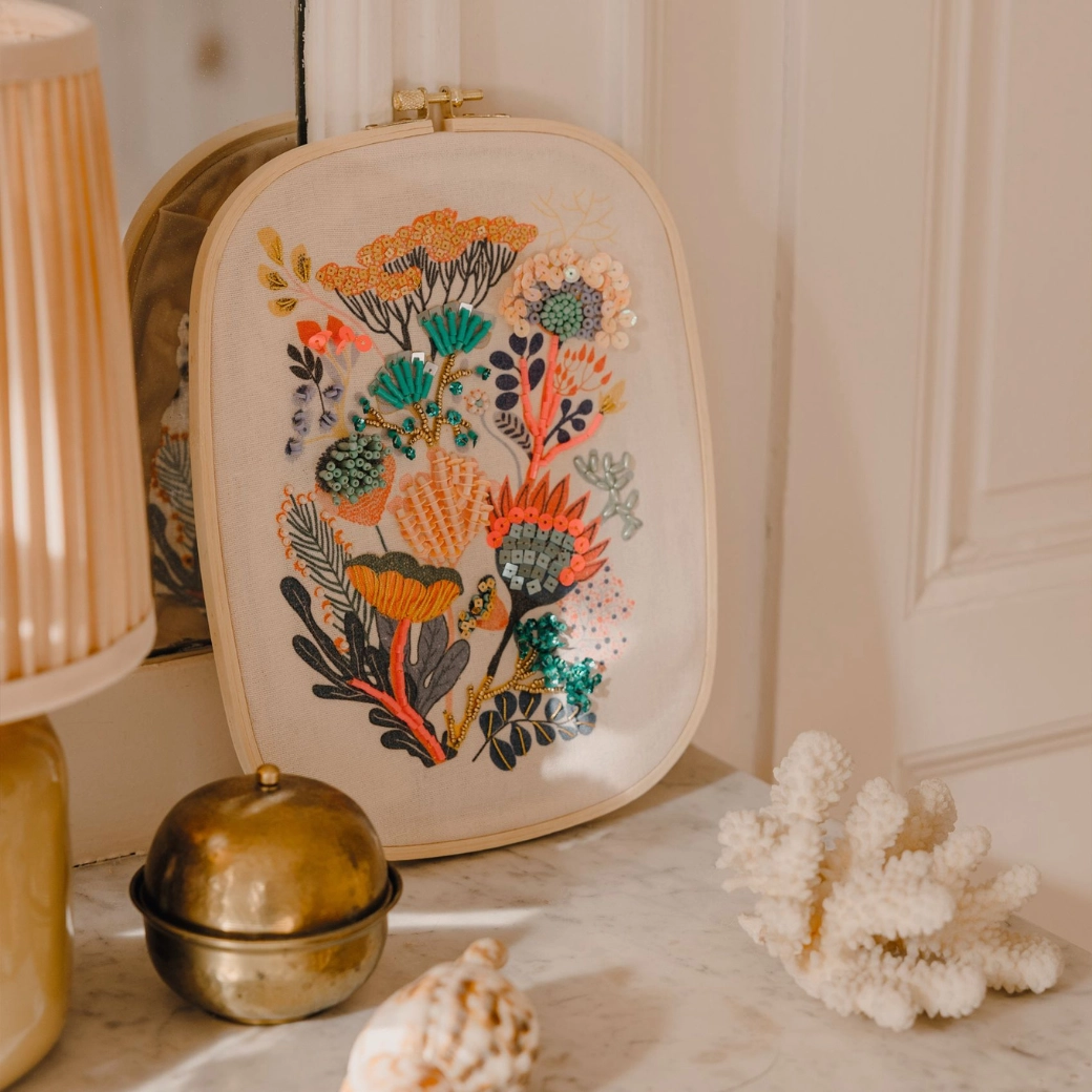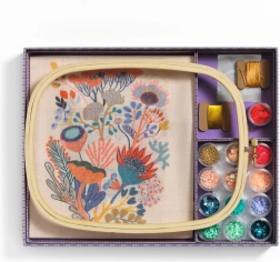 Acest set creativ pentru broderie cu mărgele conține tot ce ai nevoie pentru a crea un motiv floral superb: ramă de brodat din lemn, material textil imprimat, fire de bumbac, ace, o selecție de mărgele și paiete lucioase și accesorii practice pentru un finisaj curat. Este ideal atât pentru începători, cât și pentru avansați – procesul este intuitiv și te răsplătește cu un rezultat sofisticat, strălucitor, potrivit pentru a fi agățat pe perete.