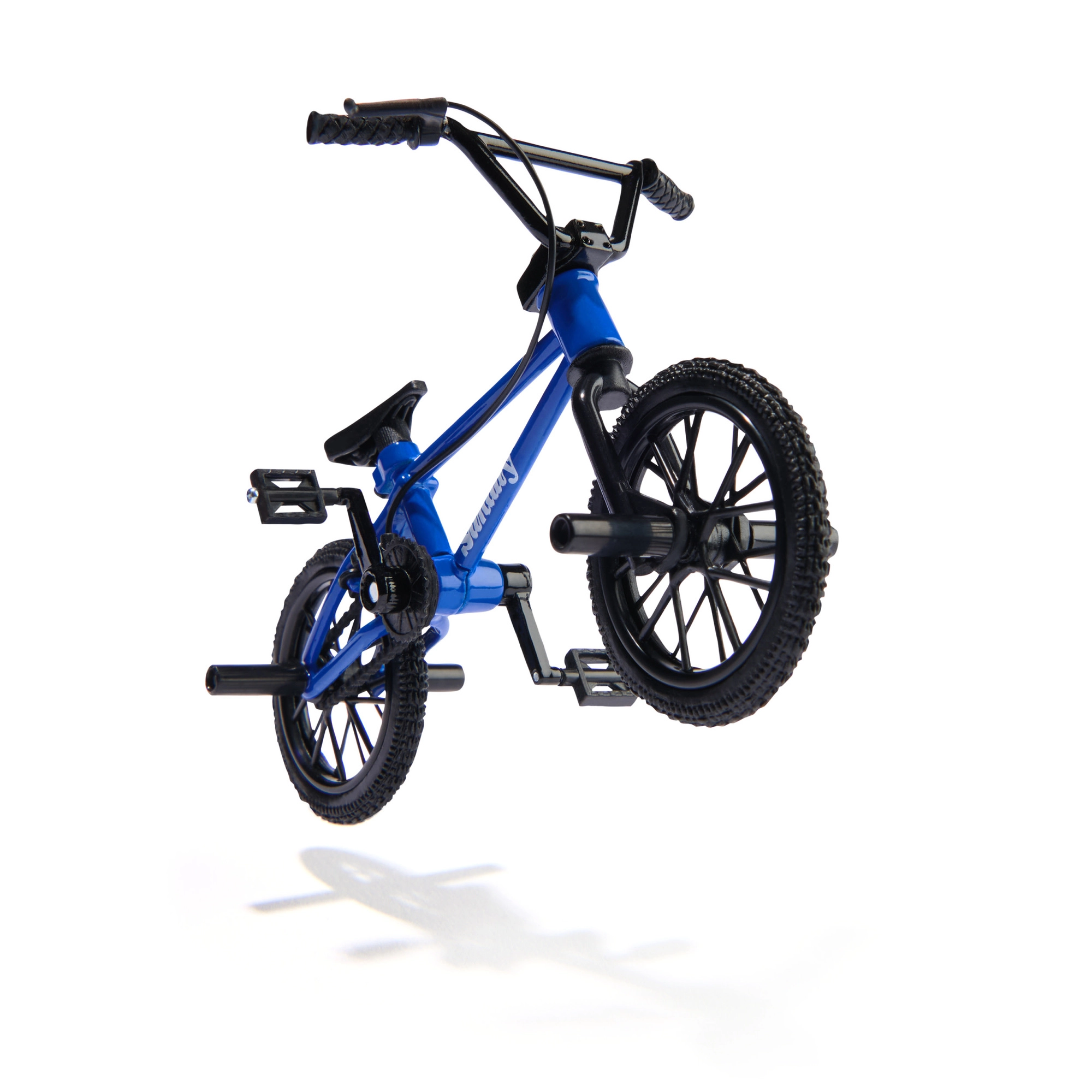 Finger BMX-ul albastru SUNDAY cu cadru detaliat, spițe, pedale și peg-uri permite antrenarea trucurilor freestyle direct pe birou.