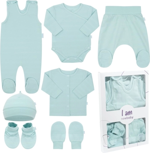 Set complet pentru nou-născuți NEW BABY I AM într-o nuanță delicată de mentă, confecționat din bumbac 100% moale, potrivit pentru pielea sensibilă a bebelușilor. Conține body cu capse, salopetă (dupačky), pantaloni cu picior (polodupačky), jachetă și căciuliță. Îmbrăcare ușoară datorită închiderii practice cu capse, confort asigurat de materialul respirabil și mansoanele late. Ideal pentru maternitate și purtare zilnică, excelent și ca cadou.