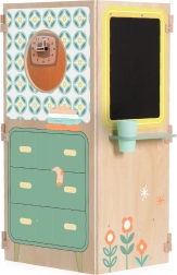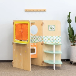 Această căsuță din lemn oferă copiilor posibilități infinite de joc imaginar – de la gătit în bucătărie, spălat în spălătorie până la teatru de păpuși la fereastră. Include și o practică tablă pentru desen și notarea sarcinilor. Construcția robustă din materiale de calitate garantează siguranță și durabilitate îndelungată.