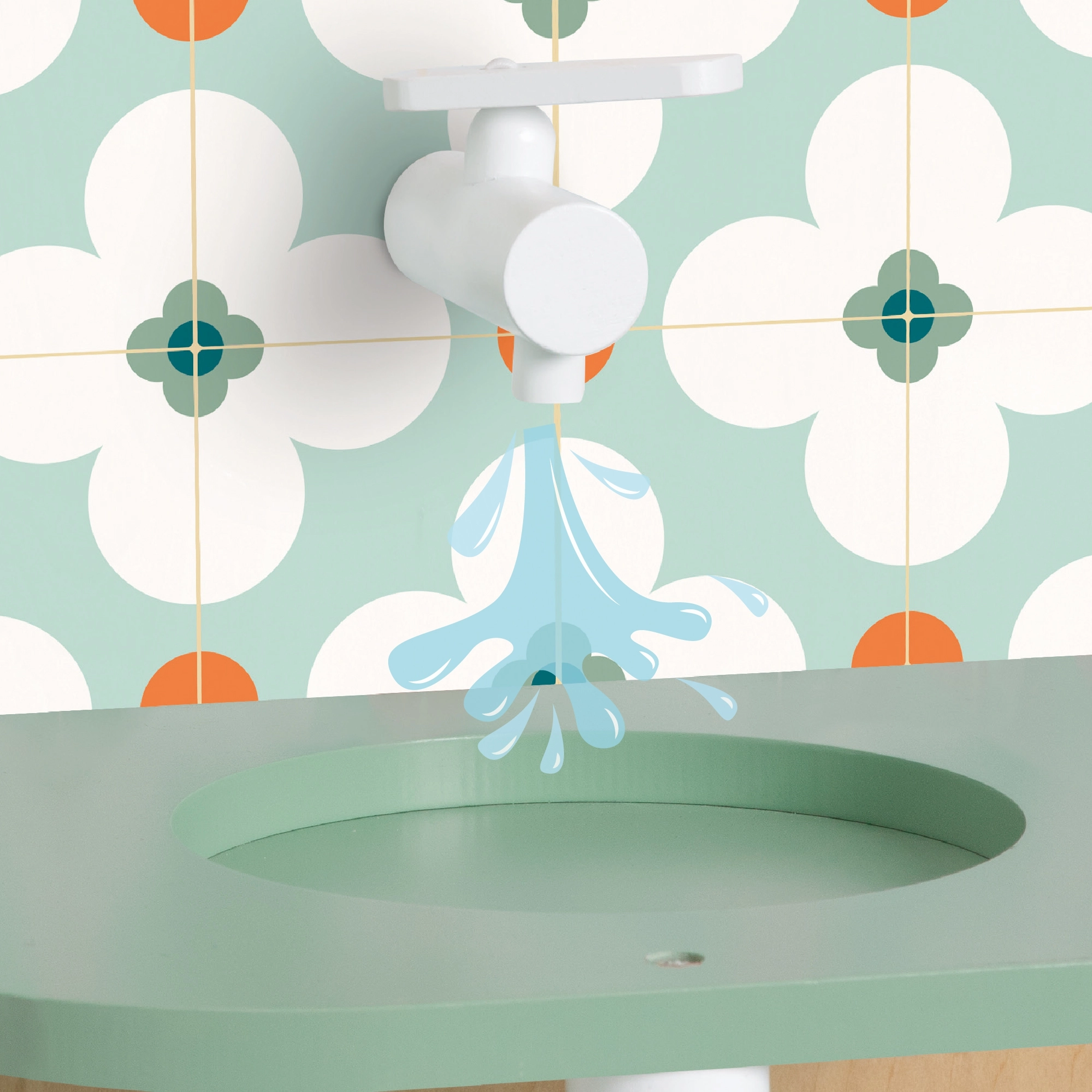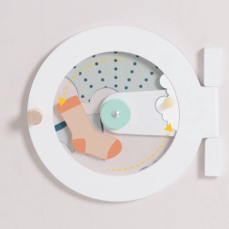 „Mașina de spălat” încorporată, cu fereastră rotundă și elemente de control, extinde temele de joc – de la spălat la sortarea rufelor și îngrijirea gospodăriei.