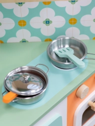 Copiii pot „găti”, coace și servi la fereastră. Ușițele care se deschid, butoanele rotative și rafturile susțin jocul realist și organizarea accesoriilor.