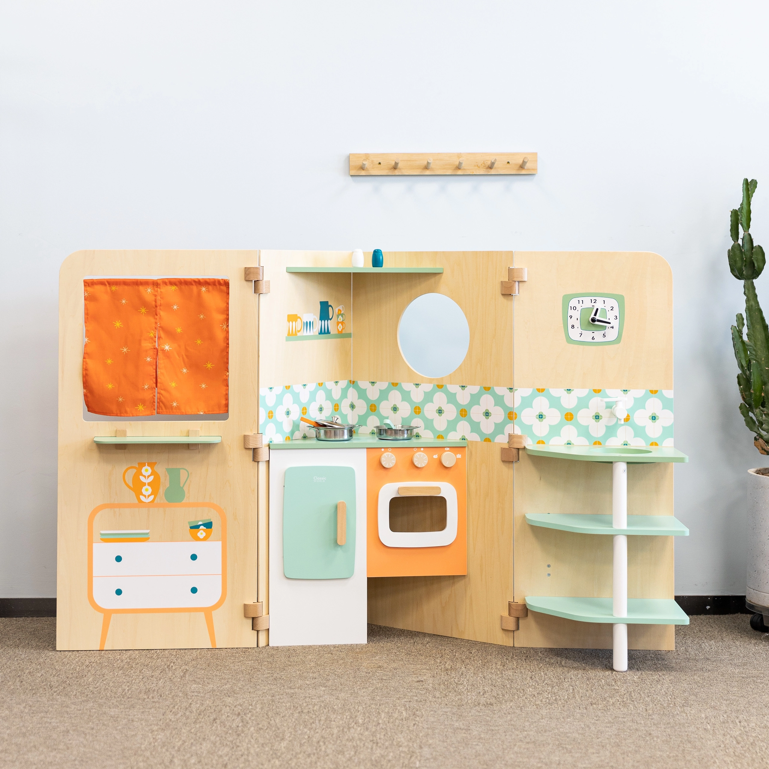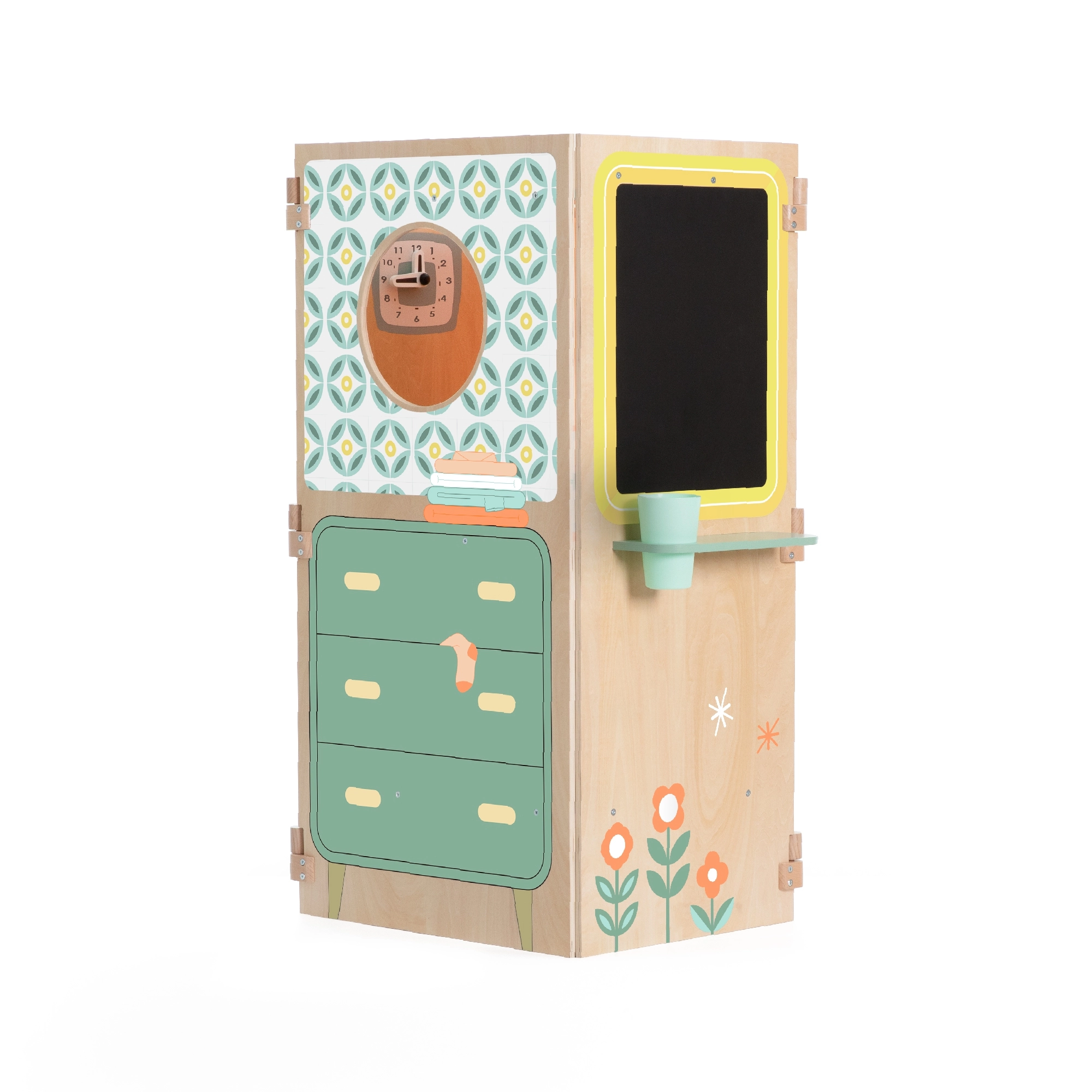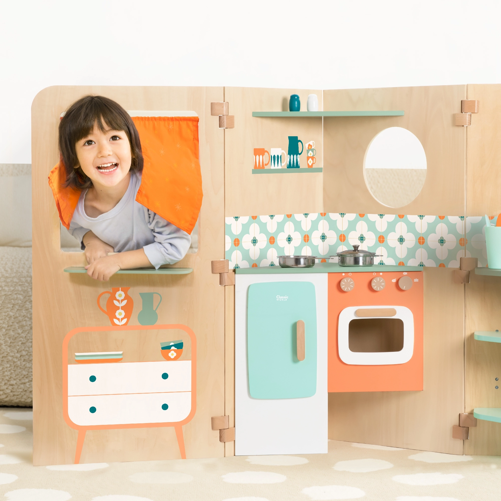 Descoperiți căsuța multifuncțională pliabilă CLASSIC WORLD, care îmbină bucătăria, spălătoria, tabla de scris și fereastra pentru teatru de păpuși într-un set compact. Datorită deschiderii și plierii ingenioase, nu ocupă loc, susține jocul creativ, jocul de rol și dezvoltarea motricității copiilor de la 3 ani.