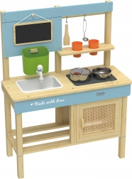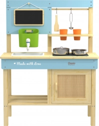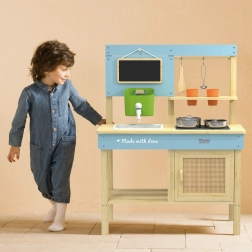 Această bucătărie pentru copii, de înaltă calitate, este realizată din lemn natural certificat și proiectată fără margini ascuțite, pentru joacă în siguranță de la 3 ani. Datorită construcției rezistente și organizării inteligente, cu cârlige și rafturi, copiii depozitează ușor vasele și ustensilele. Mica tăbliță servește drept meniu sau listă de sarcini – ai nevoie doar de cretă, iar imaginația pornește în forță.