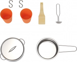 În pachet găsești: oale cu capace, 2 pahare, spatulă, lingură, cârlige suspendate, tăbliță cu cretă și echipare de bază a bucătăriei (chiuvetă, plite, rafturi). Alegerea perfectă pentru colțuri de joacă exterioare sau interioare pentru micii bucătari.