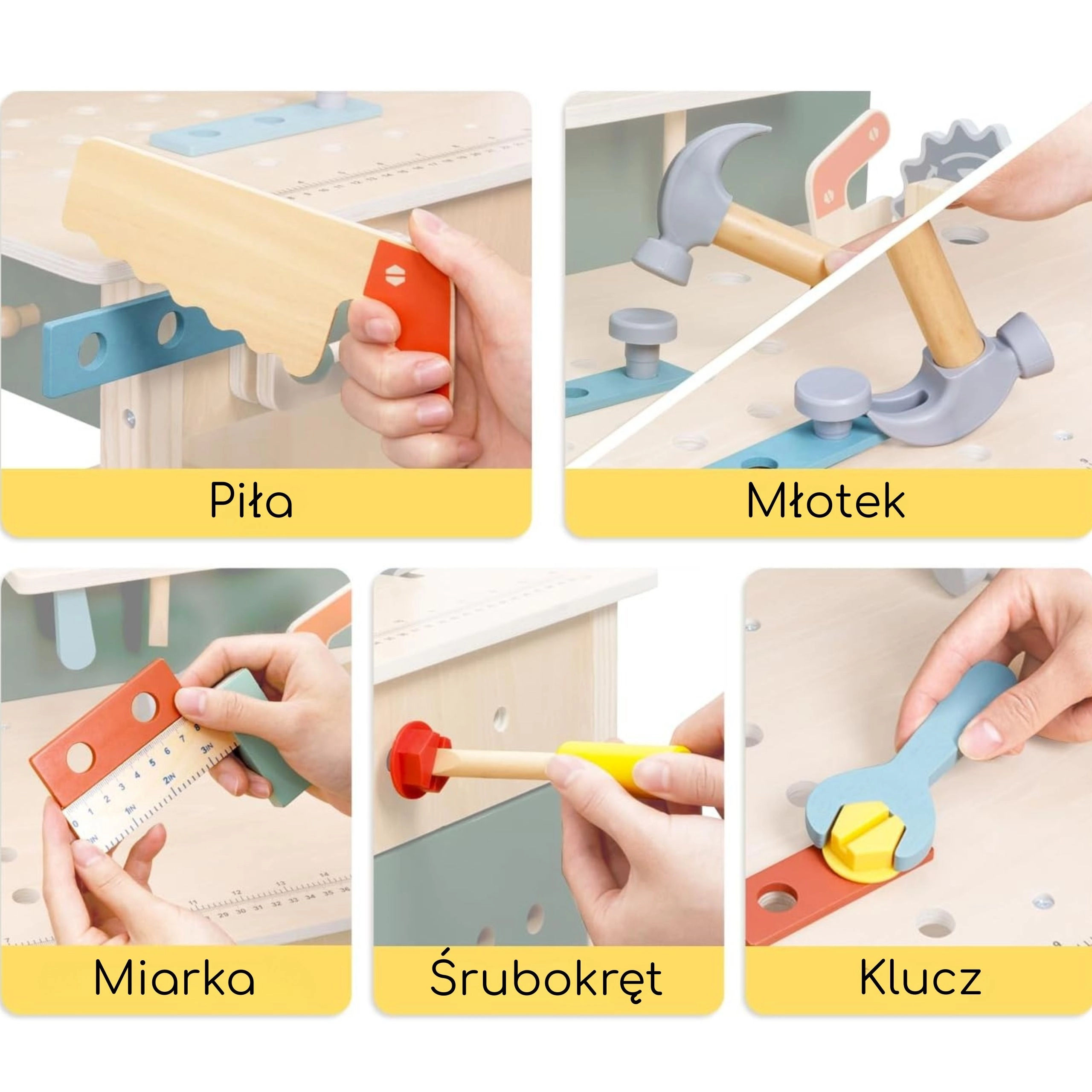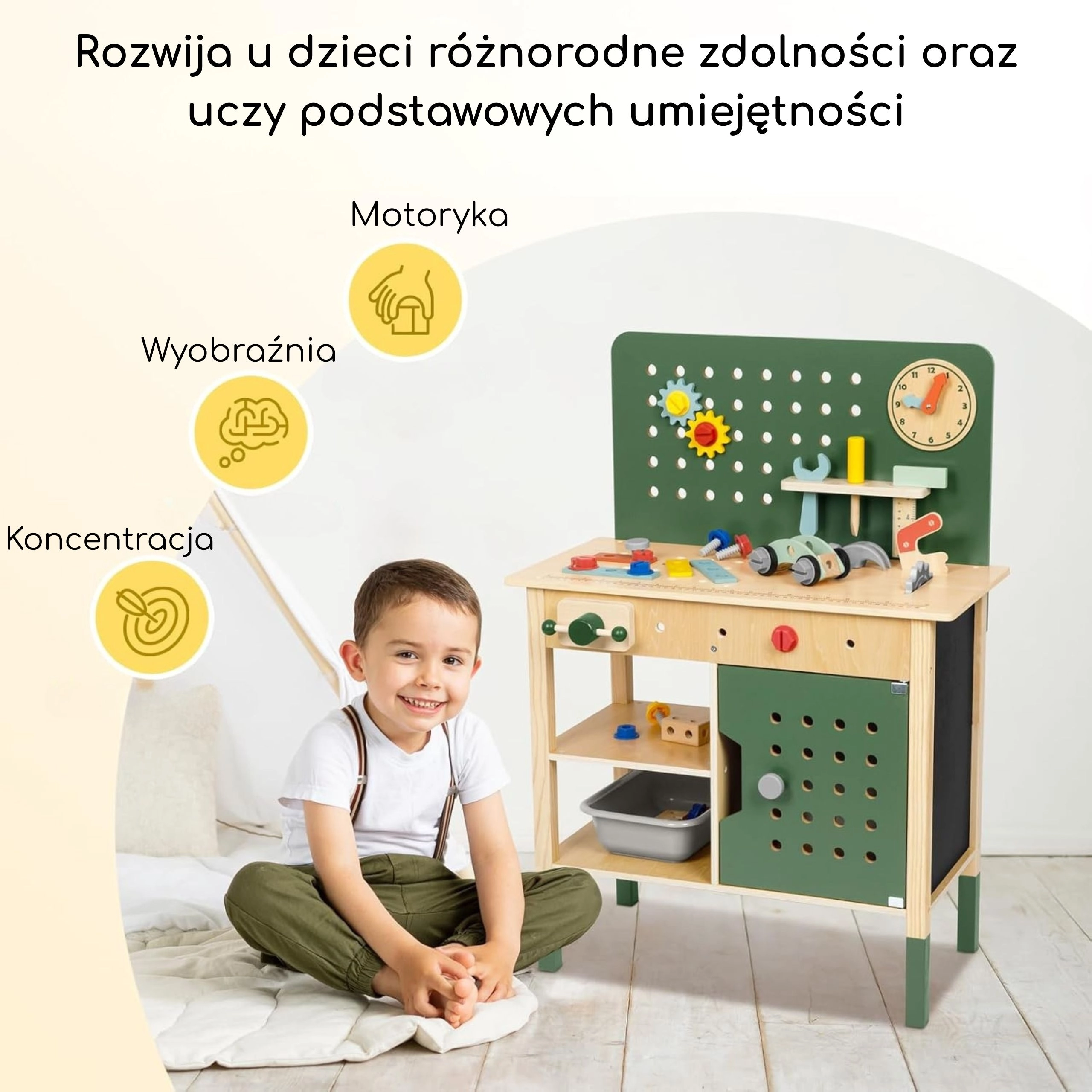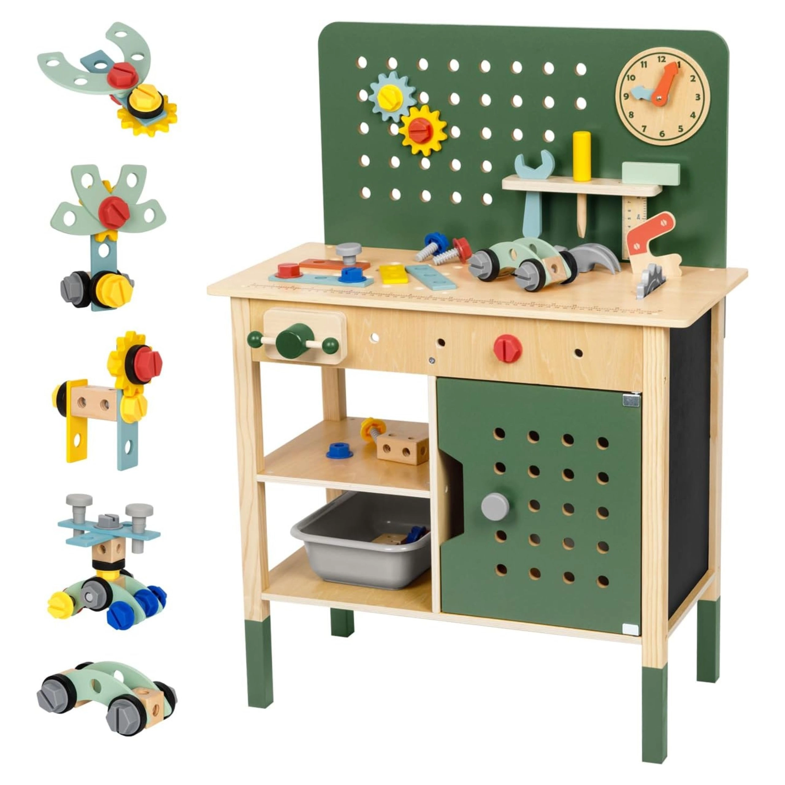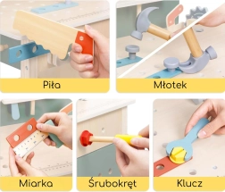 Atelierul include elemente realiste: menghină pentru fixarea pieselor, un „fierăstrău” sigur pentru jocul de tăiere, tablă cu cretă pentru schițe și idei, ceas cu ace mobile pentru învățarea orei și suporturi pentru unelte cu perete perforat suspendat. Setul conține șuruburi, piulițe, roți dințate și conectori din lemn pentru construirea de vehicule și structuri, care dezvoltă coordonarea mână–ochi, răbdarea și creativitatea.