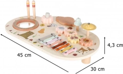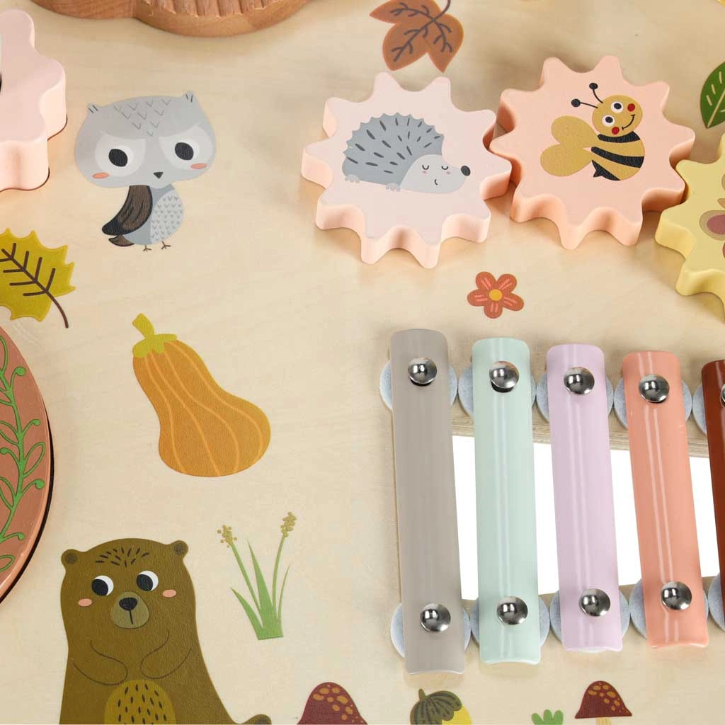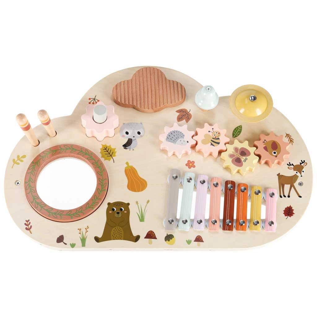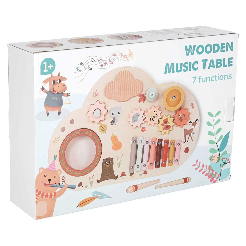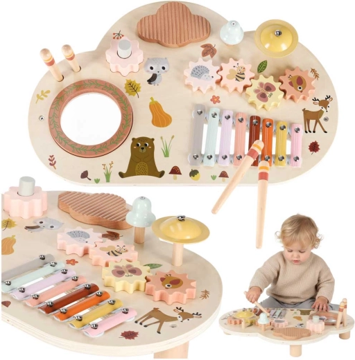 Descoperă lumea ritmului și creativității cu această măsuță muzicală din lemn pentru cei mici. Combină xilofon, tobă, clopoțel și alte elemente senzoriale pentru distracție, învățare și dezvoltarea motricității. Datorită picioarelor stabile, lemnului de calitate și designului pastelat, este alegerea ideală pentru primele descoperiri muzicale.