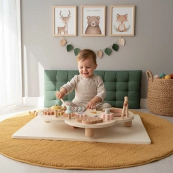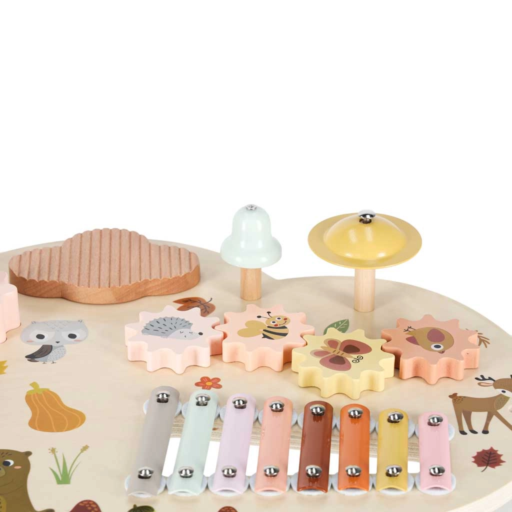 Picioarele joase și blatul robust din lemn natural asigură stabilitate la bătut, rotit și bătut din palme – ideal pentru toddleri.