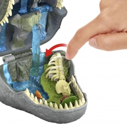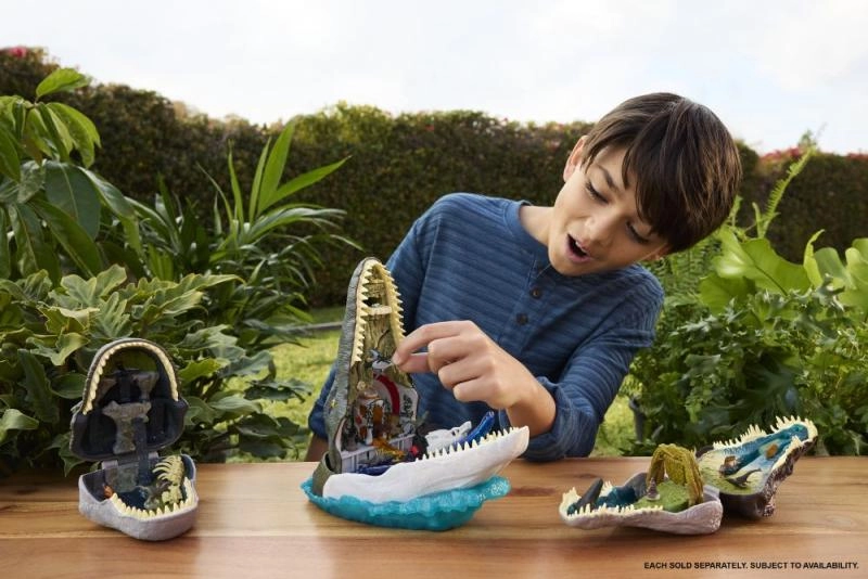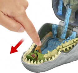 Acest „Micro lumea dinozaurilor” compact aduce experiențe mari într-un format mic. Capul de dinozaur cu dinți ascuțiți se deschide la un unghi de 90° și dezvăluie un set de joc plin de acțiune inspirat de universul cinematografic. Patru medii diferite, trei microfigurine și numeroase mecanisme acționate cu degetul stimulează poveștile creative și motricitatea fină.