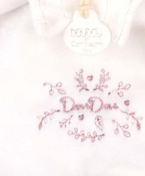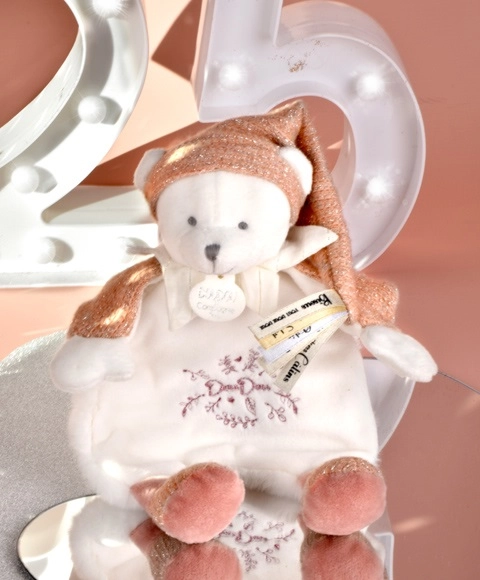 Acest ursuleț de pluș delicat încântă prin aspectul său gingaș și prin calitatea execuției. Căciulița roz, lăbuțele moi ca niște botoșei și broderia discretă Doudou de pe burtică creează o jucărie la care bebelușul va dori să se cuibărească. Suprafața catifelată stimulează simțurile și liniștește la adormire.