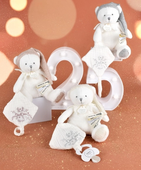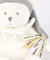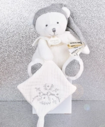 Acest set cadou elegant îmbină confortul și funcționalitatea într-un singur produs. Ursulețul moale, cu căciuliță și guler, are cusută de lăbuță o păturică fină care liniștește și ajută la adormirea mai ușoară. La capătul păturicii se află un suport practic pentru suzetă, datorită căruia suzeta rămâne mereu curată și ușor accesibilă.